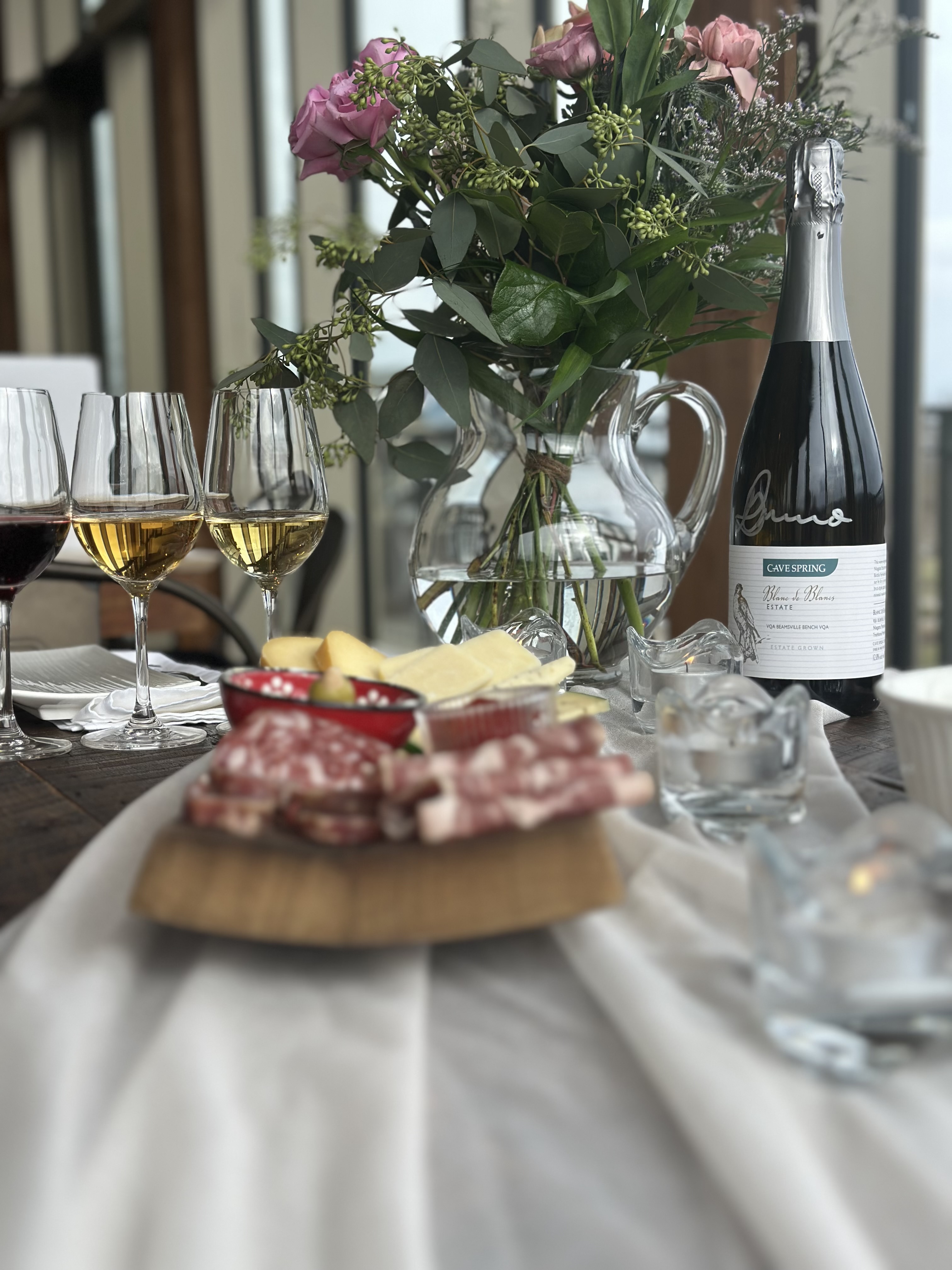 A romantic experience awaits at our Vineyard Tasting Room. Upon arrival, you'll be greeted with a bouquet of beautiful flowers. Enjoy a tasting flight at an elegantly decorated table for two on our upper mezzanine, offering stunning views of the vineyard. To enhance your experience, a beautifully curated meat and cheese board will be yours to share. As a keepsake of this special occasion, take home a bottle of our sparkling wine, personally signed by our winemaker. This is an experience you will cherish forever!