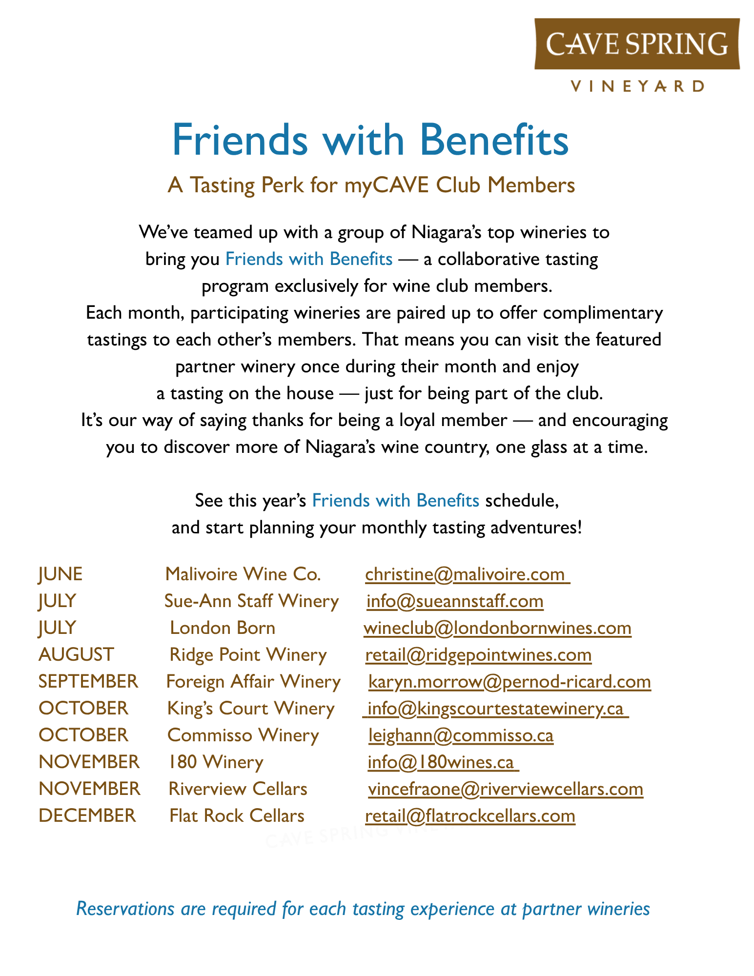 Visit participating wineries with the 'Friends with Benefits' wine club member program and enjoy complimentary tasting experience for you and three guests. Click here to see schedule for 2025.